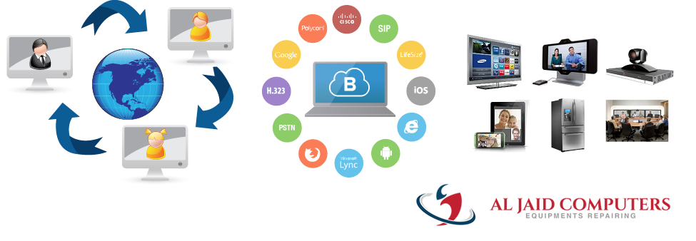 Video conferencing is two-way interactive communication delivered using telephone or Internet technologies that allows people at different location to come together for a meeting. The video conference can be as simple as a conversation between two people in private offices (point-to-point) or involve several sites (multi-point) with more than one person in large rooms at different sites. AL JAID Computers Equipment Repairing helps you save travel time and money by providing quality access anywhere.